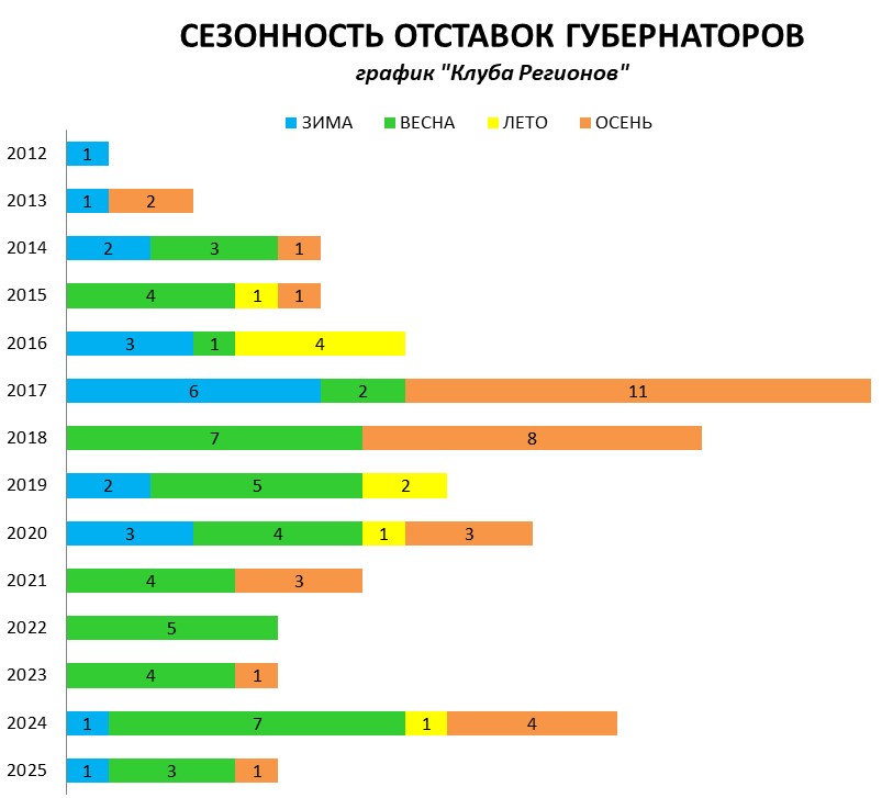 По подсчету «Клуба Регионов», с 2012 по 2025 годы самым популярным сезоном для губернаторских отставок стала весна – 49 отставок. Осенью были уволены 35 глав регионов, зимой – 20, и всего девять человек – летом.